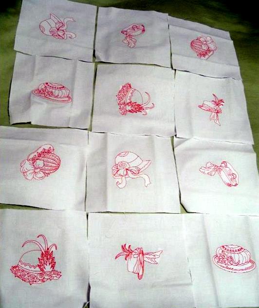 decided to use this pattern in the making of a quilt. i have had these redwork hat blocks for many years and have collected some fabric to use for the quilt and it seems this is the right time.